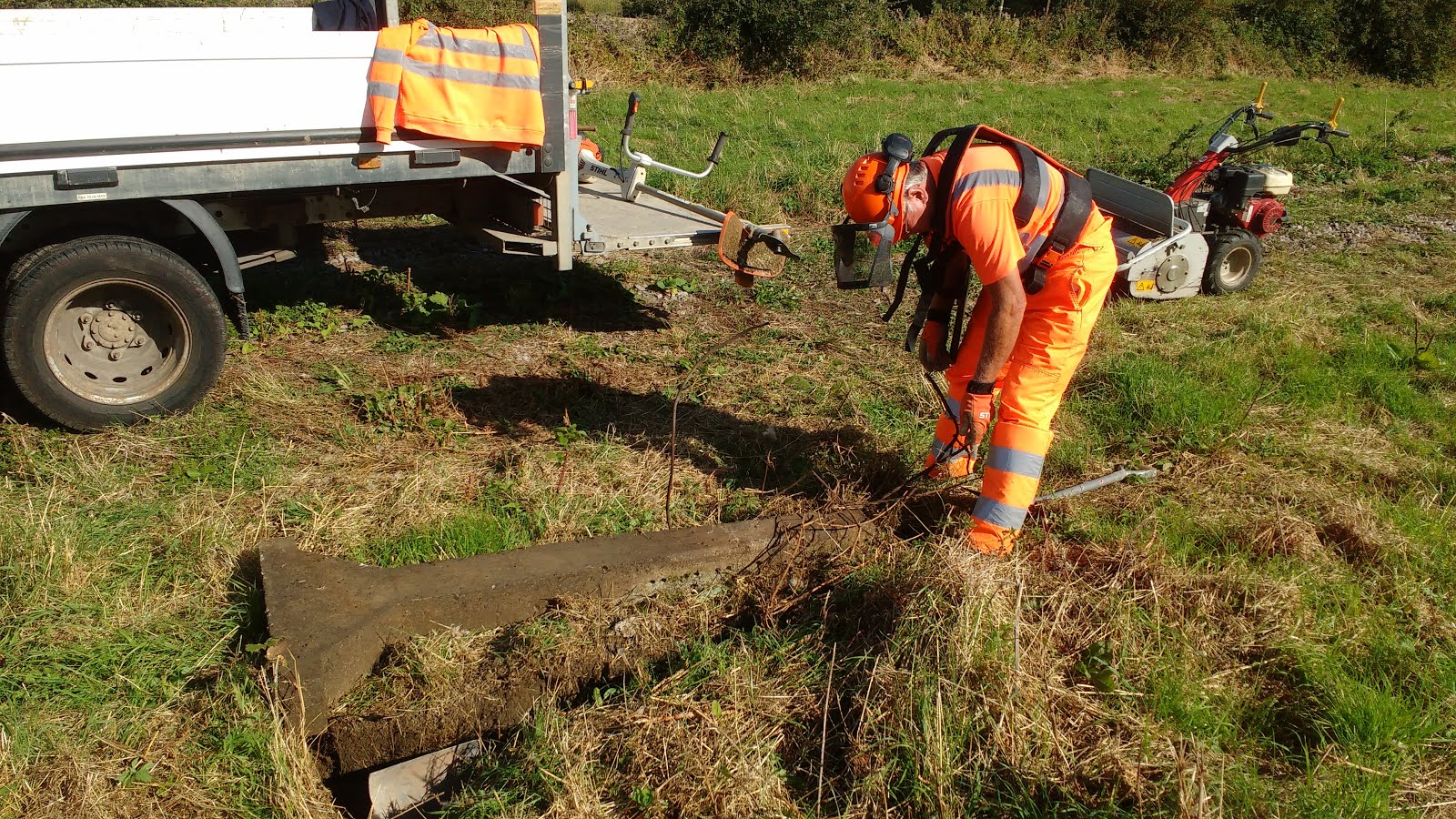 You would have thought that we would have learnt by now not to poke around when we see something. We haven't, one of the sharp eyed operatives spotted a bit of wire sticking up in the grass near the truck at lunchtime. Being good corporate citizens, we decide to pick it up, only it turned out to be a bit of rebar still attached to a rather large lump of concrete. It looks like an over-engineered end post for a wire fence, it must have had that big foot around 4ft deep in the ground when it was set upright.