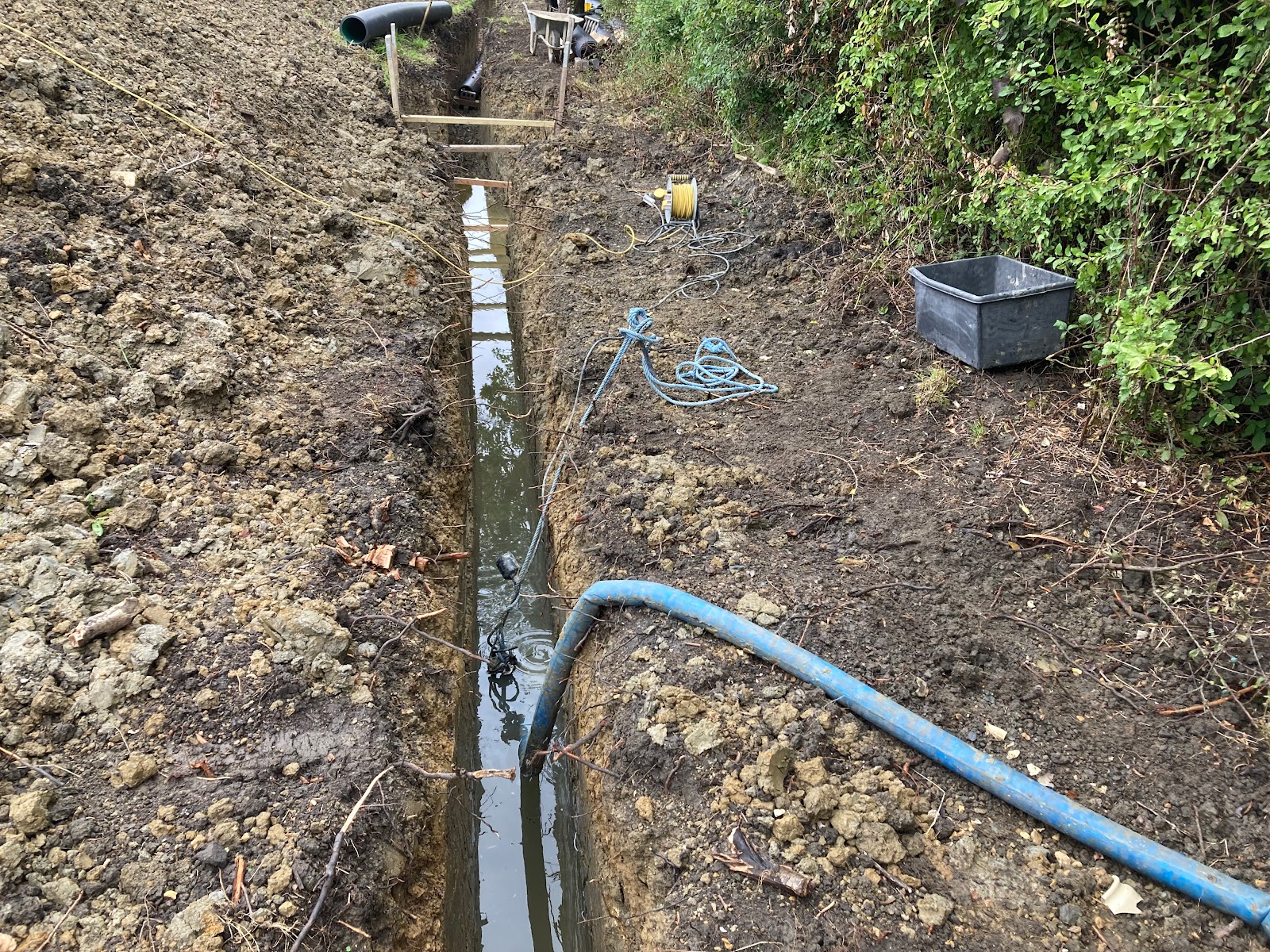We used our new(ish) 110v electric pump to pump out the accumulated rainwater in the third section of the ditch. Once removed we noticed a small flow in the installed pipes, this is from old land drains which now drain into the intermediate chambers.