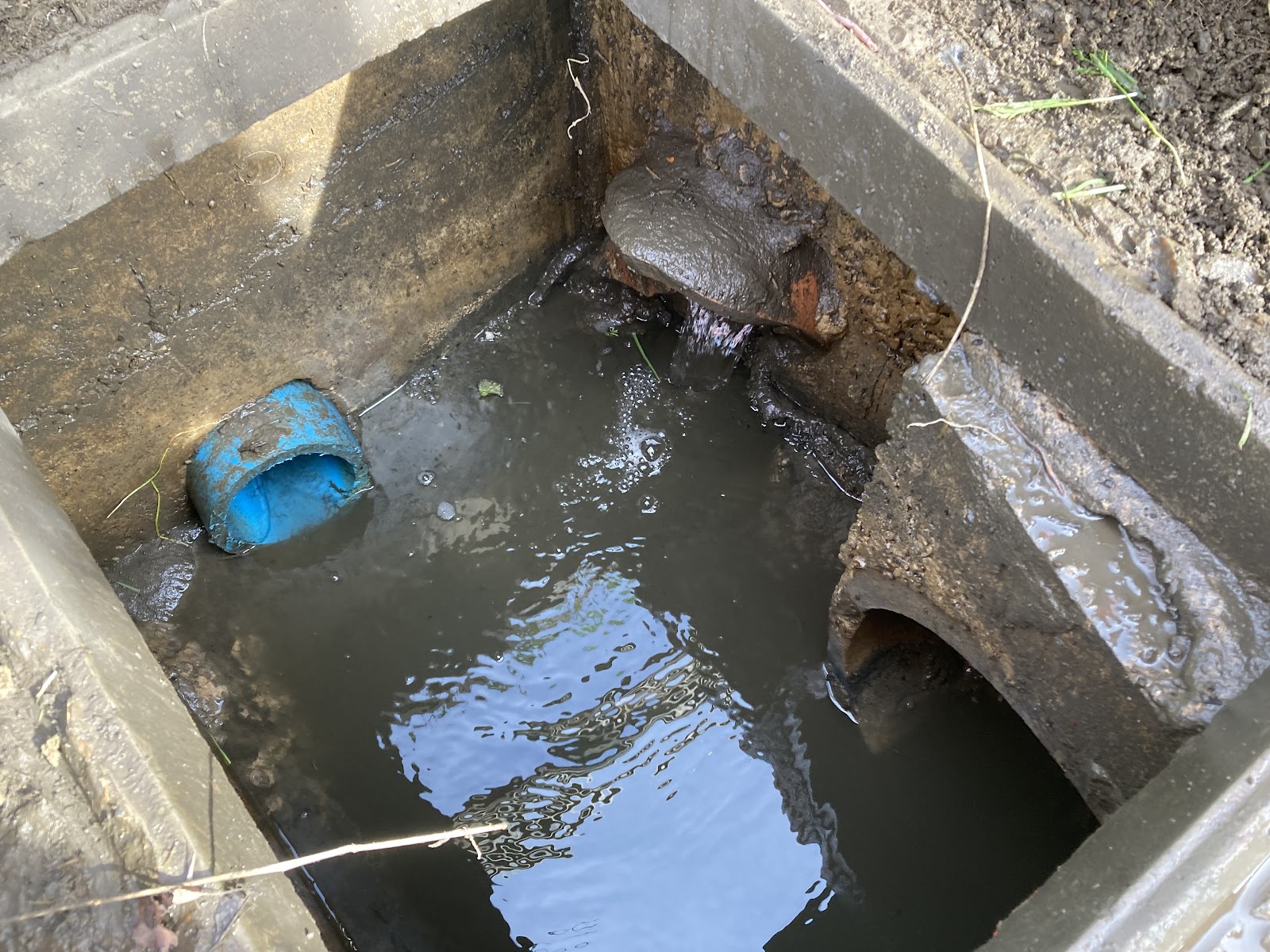 | The blue plastic pipe is the exit to the down side cess, whilst the two larger pipes on the right are the inlets from the roadside ditch on Southam Lane. |