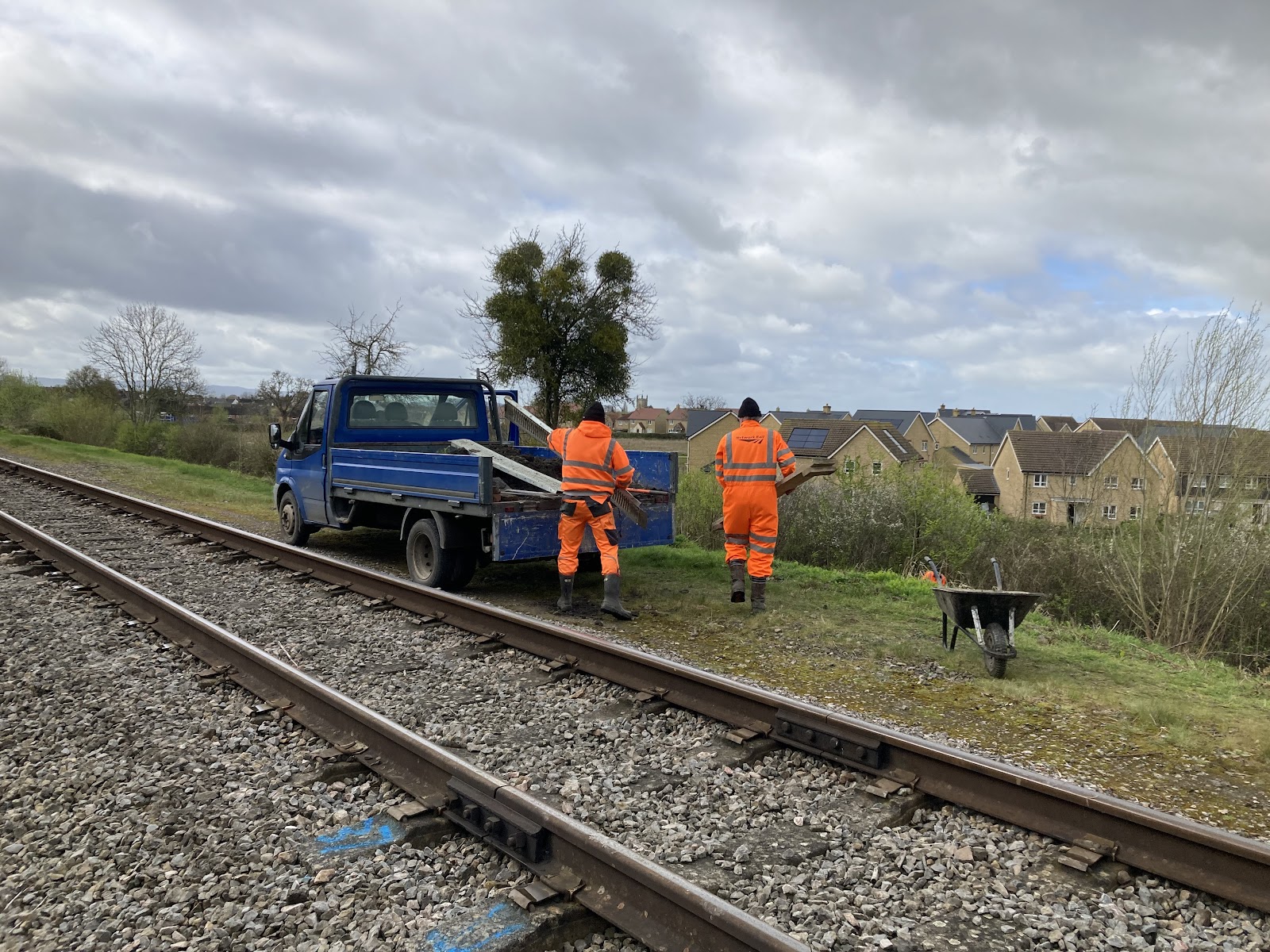 | Stuart and Martin begin to replace the roadside fence at Gotherington Yard. It was removed to enable the excavator to access the low mileage side of culvert 33B to level our the clay infill. |
